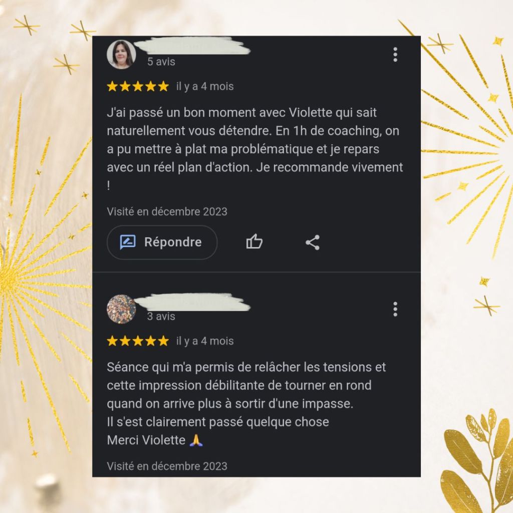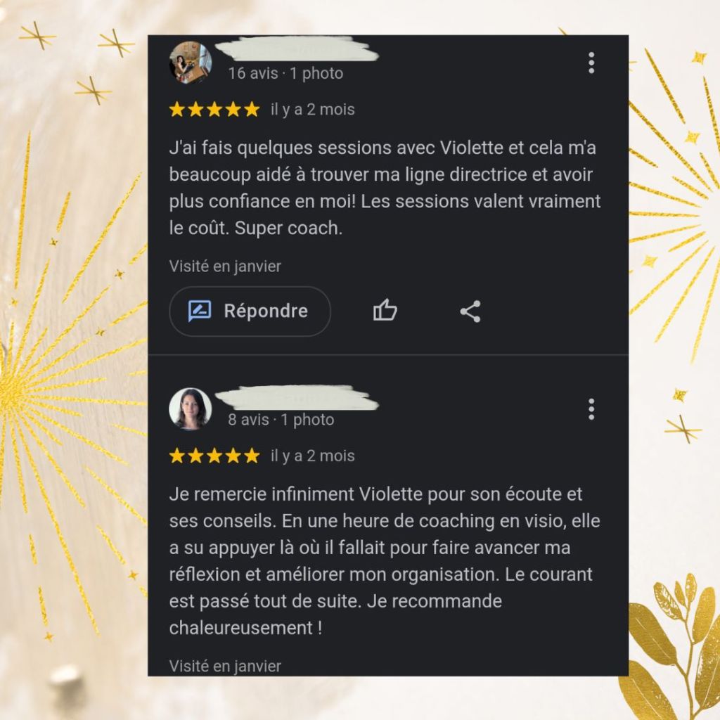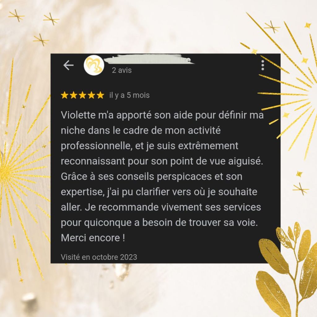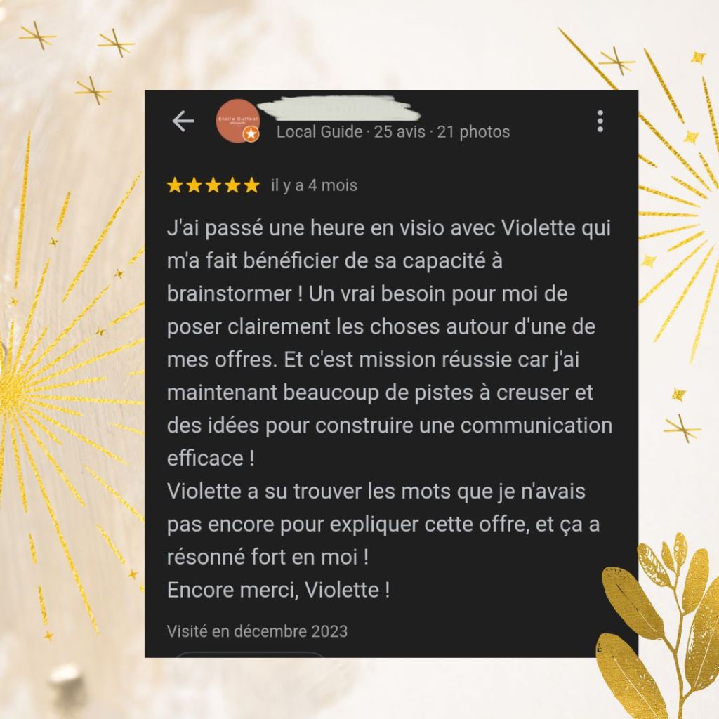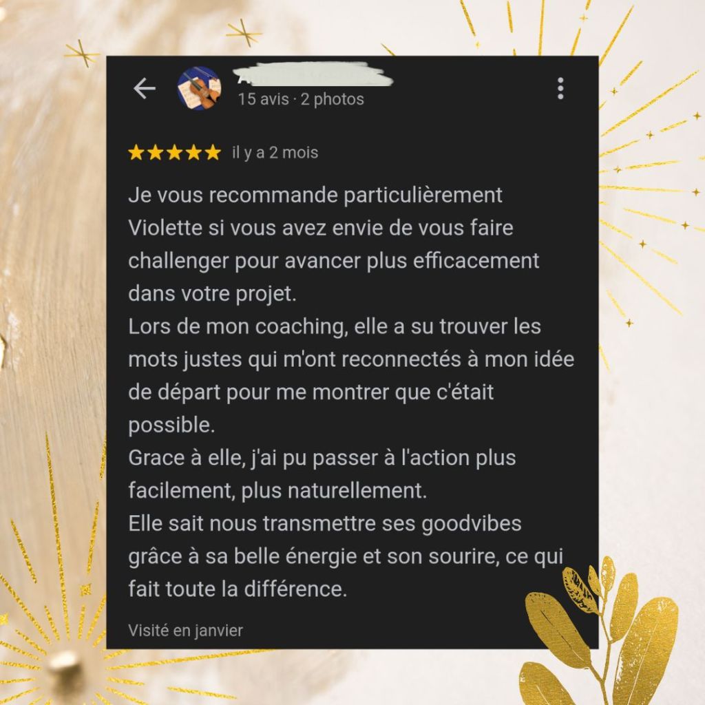 Violette est à l’écoute, pertinente, bienveillante, et surtout très encourageante ! Elle a créé une atmosphère où on ne se sent plus seul dans notre projet, on se sent compris, et surtout elle nous fait avancer à pas de géants, pour des projets parfois enfouis depuis longtemps. Elle nous fait aussi rencontrer d’autres porteurs de projets, ce qui est très enrichissant. Je recommande Violette à 1000% !